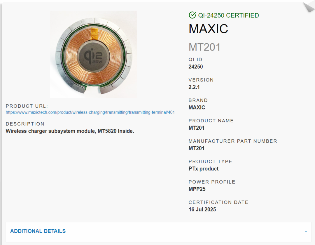 美芯晟自主研發(fā)的無線充電發(fā)射端模組已通過最新的Qi2.2.1認證,Qi認證ID為24250,料號為MT201,Qi無線充電功率達25W(MPP25),內(nèi)置美芯晟一芯多充無線充電發(fā)射端芯片MT5820,支持BPP、EPP和MPP(5W/15W/25W)三種功率配置。