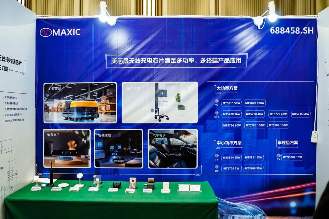 在無線充電發(fā)射端,攜全球首批通過Qi2.2.1認(rèn)證的MT201模組重磅亮相,內(nèi)置美芯晟一芯多充無線充電發(fā)射端芯片MT5820,支持MPP 25W 的大功率高集成度無線充電發(fā)射端芯片,采用先進(jìn)的磁感應(yīng)技術(shù),完全符合最新WPC Qi2.2標(biāo)準(zhǔn),支持BPP、EPP和MPP(5W/15W/25W)三種功率配置,集成一芯多充功能,最高傳輸功率可達(dá)100W。