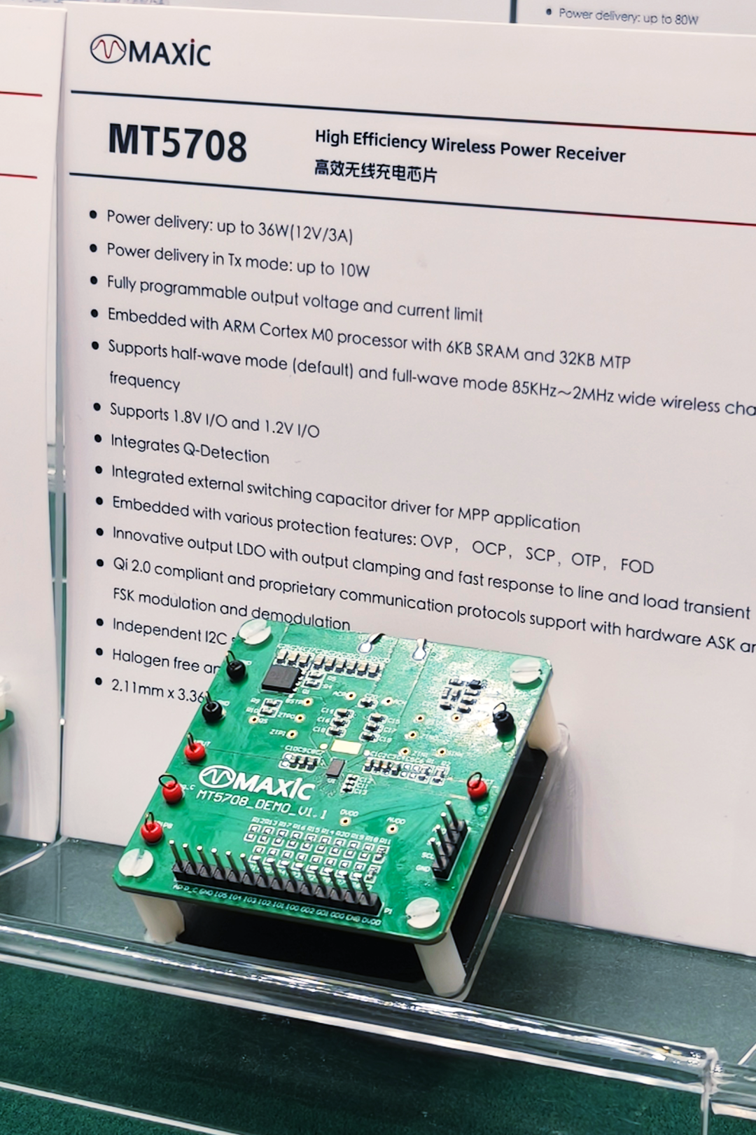 在無線充電接收端,重點(diǎn)展示了高度集成、高功率密度的36W無線充電RTX 芯片MT5708和高集成高效率支持BPP/EPP/MPP的100W無線充電RTX芯片MT5788。