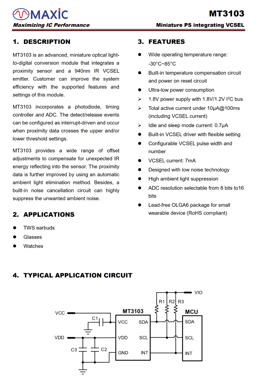 MT3103系列是一款小尺寸、超低功耗、高信噪比、集成940nm VCSEL的數(shù)字光學(xué)接近傳感器,待機(jī)功耗低至0.7uA,配有公司自研自適應(yīng)底噪抑制算法,有效提升入耳檢測效率。主要應(yīng)用于TWS/OWS等無線藍(lán)牙耳機(jī)、VR/AR智能眼鏡、智能手表、便攜式智能硬件產(chǎn)品等。