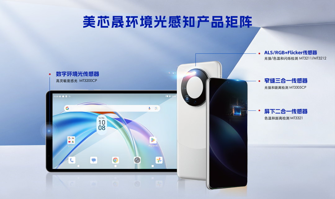 美芯晟已構(gòu)建了完整的環(huán)境光感知產(chǎn)品矩陣:從MT3200CP等基礎(chǔ)的高精度環(huán)境光傳感器,到可同時(shí)進(jìn)行色彩與頻閃檢測(cè)的RGB+Flicker傳感器MT3211/MT3212,再到支持屏下集成的色溫與接近二合一傳感器MT3321,全面覆蓋從智能調(diào)光到全方位光健康管理的場(chǎng)景需求。