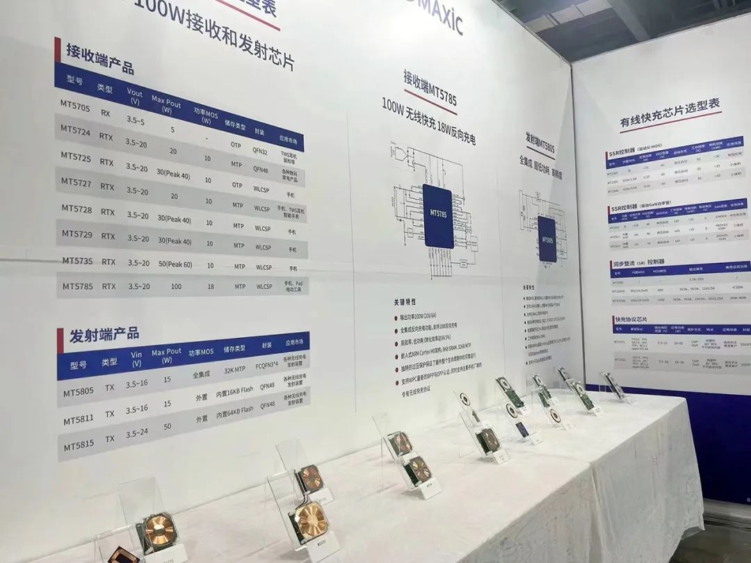 美芯晟本次帶來了1-100W全覆蓋的無線充電接收端和發(fā)射端芯片及20-65W的有線快充整體解決方案,迎來了現(xiàn)場不少業(yè)內(nèi)人士的咨詢和參觀。