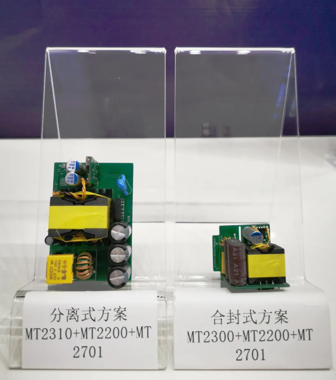 有線快充則帶來(lái)了20W-65W的整體解決方案,該方案分為分離和合封兩種,分離式方案可以讓客戶自由選擇合適的器件,最大化地發(fā)揮其自身Si MOS或GaN功率管供應(yīng)鏈優(yōu)勢(shì);而合封式方案,則有利于產(chǎn)品的小型化。