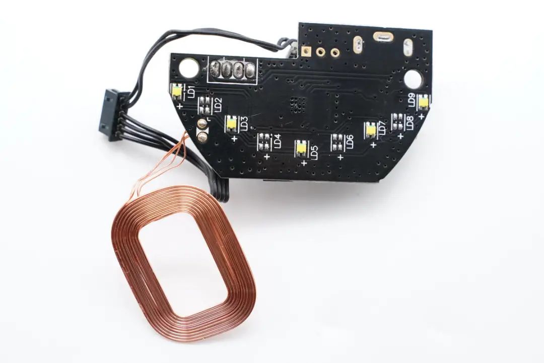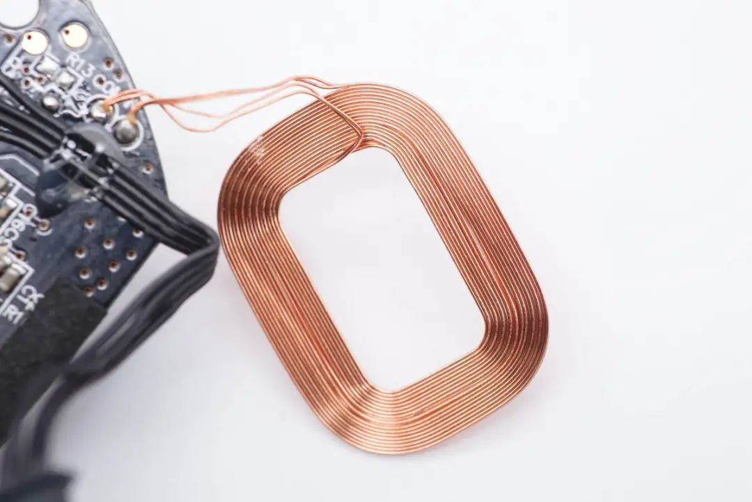 無(wú)線充電接收線圈特寫,漆包線繞制,隔磁片粘貼在電池上。