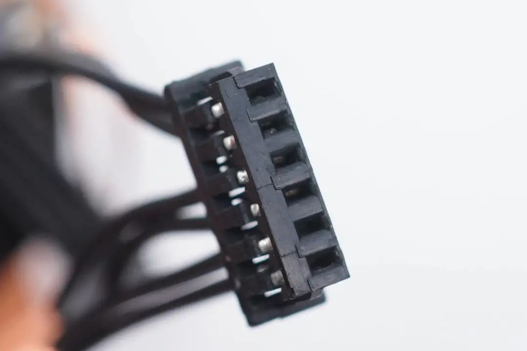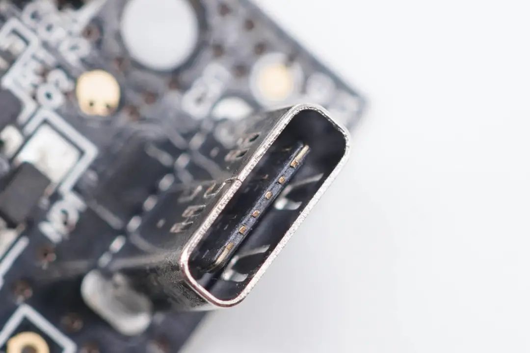 USB-C輸入母座特寫,垂直過(guò)孔焊接。