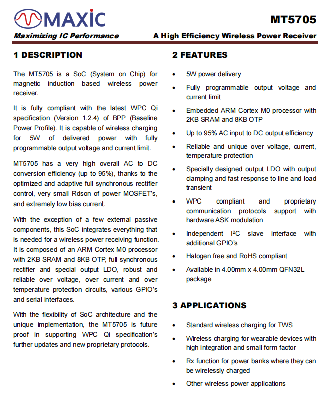 MT5705可提供穩(wěn)定的5W輸出功率,支持輸出電壓5V和電流最大1A,AC to DC轉(zhuǎn)換效率達(dá)95%;其擁有完善的過(guò)壓、過(guò)流、過(guò)溫保護(hù)機(jī)制,獨(dú)立的I2C通信接口和豐富的GPIO。封裝為4.00mm x 4.00mm QFN32L,尤其適合TWS耳機(jī)充電倉(cāng)等各類小功率智能設(shè)備。