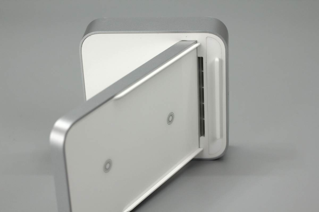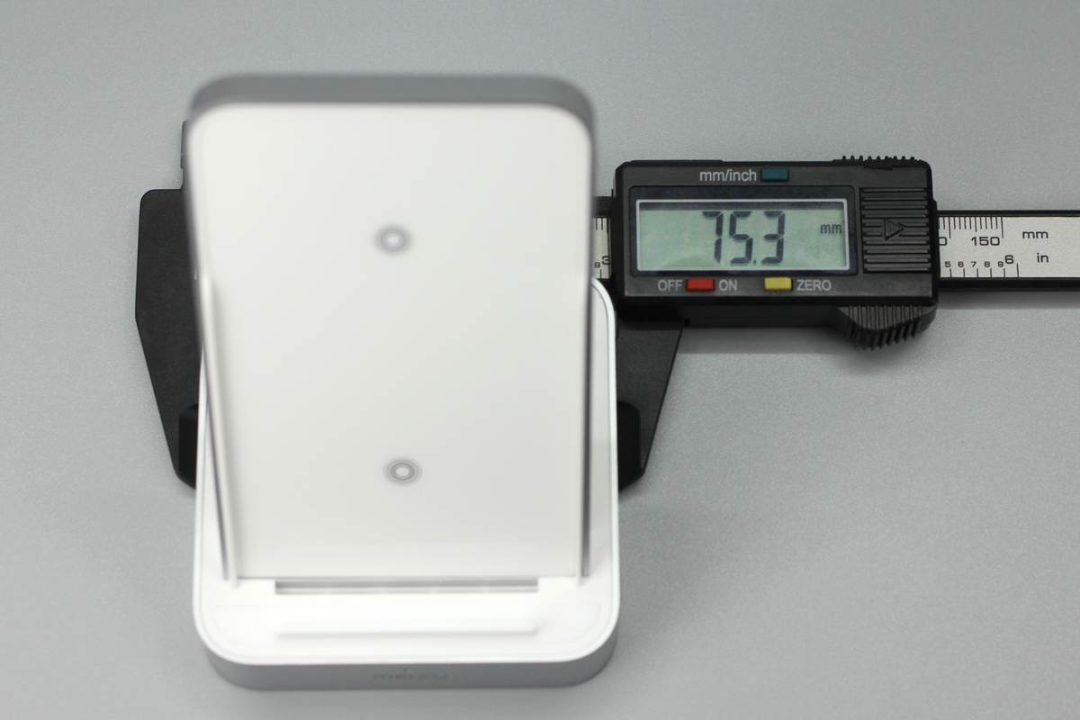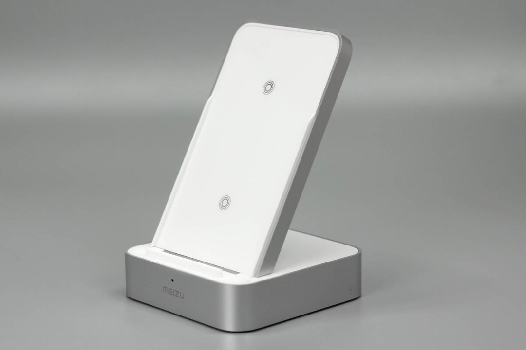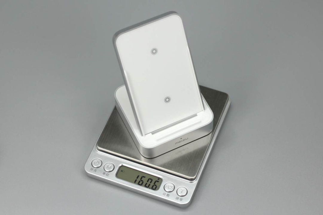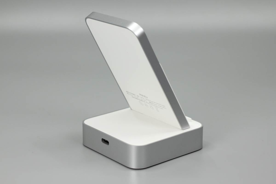 魅族這款無線充由底座和手機支撐板兩部分組成,支撐板正面是ABS材質(zhì)鋼化玻璃,十分光滑,支撐板和底座側(cè)身均噴砂銀灰色涂料進行裝飾。
