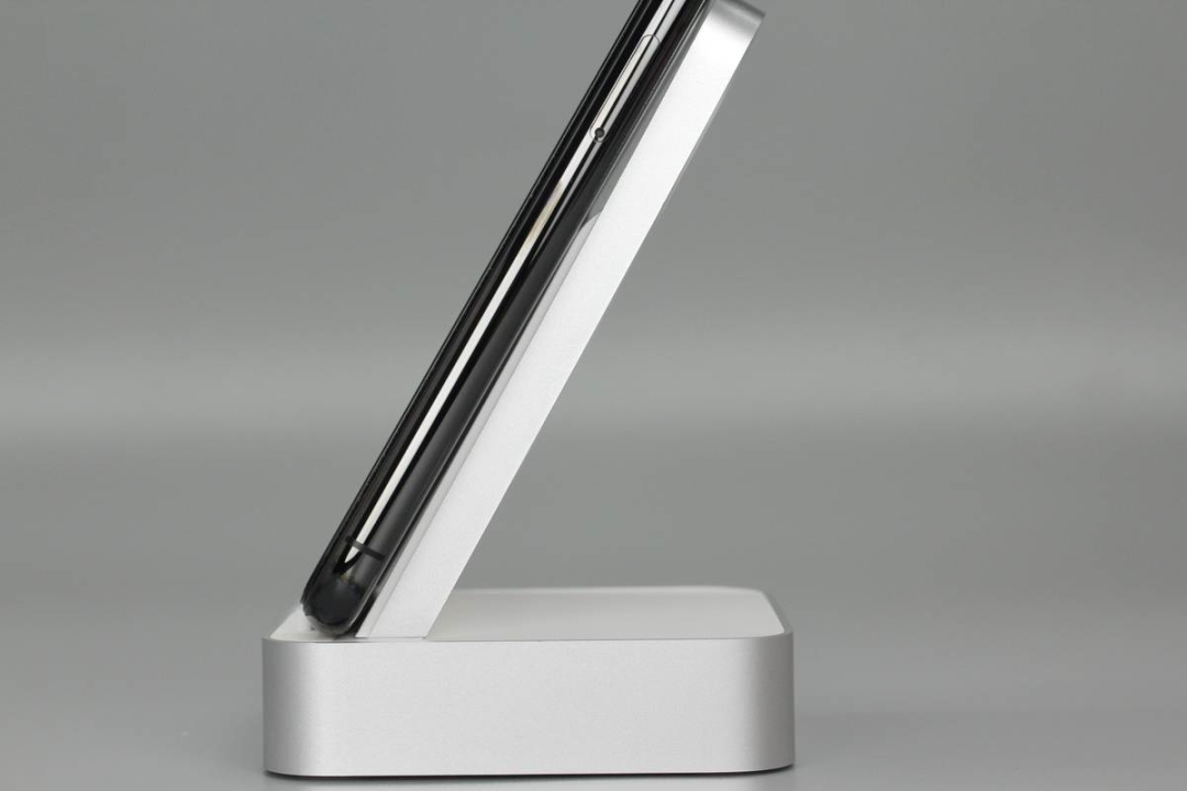 支撐板正面有兩個旋渦圖案,表示無線充區(qū)域,手機橫豎都能進行無線充電。