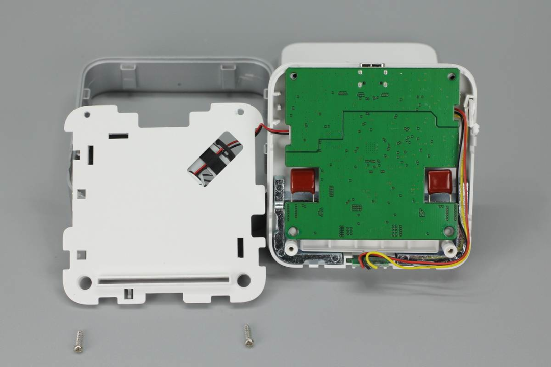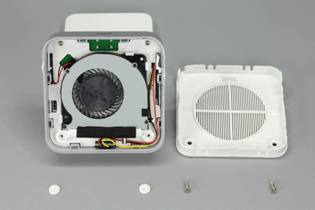 拆掉兩顆螺絲即可將底部外殼打開,風(fēng)扇使用卡扣進行固定,并且風(fēng)扇和PCB板間有一塊白色塑料板進行隔離。