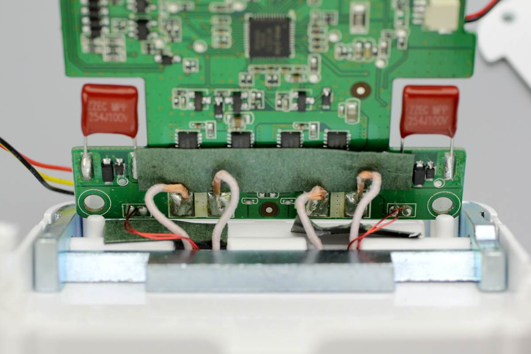 隔離塑料板以及PCB板也是使用兩顆螺絲進行固定,PCB板背面沒有設(shè)元器件,兩側(cè)的兩顆電容處鏤空處理。