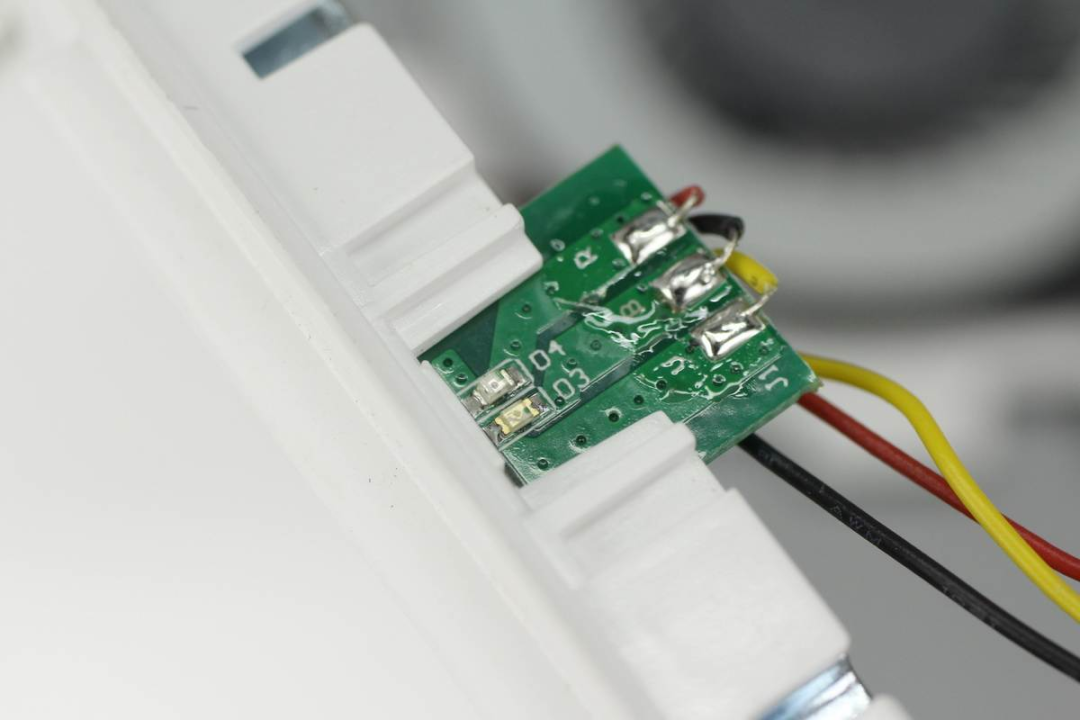 LED燈小板上設(shè)有兩顆指示燈,分別用于異物檢測和充電提示。
