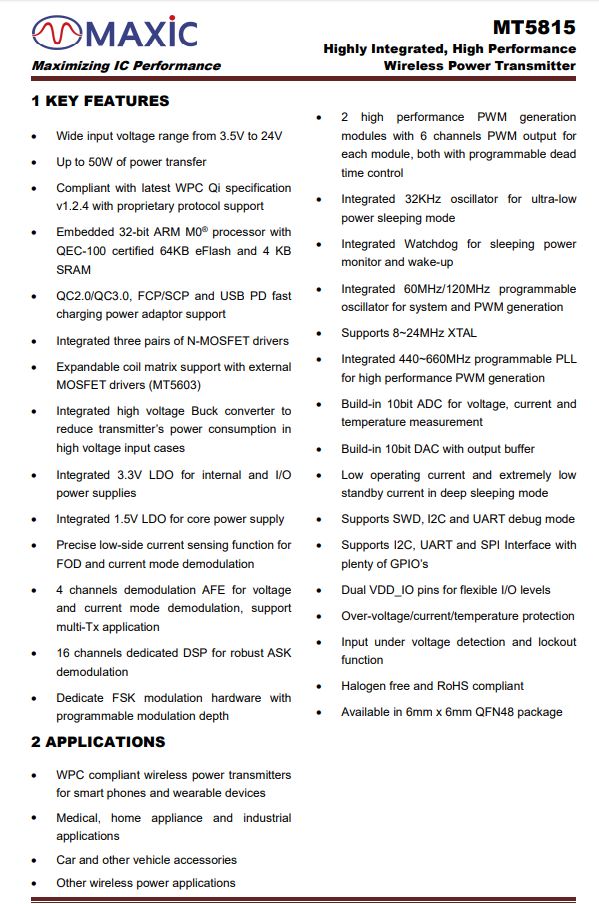 MT5815集成ARM M0 處理器,擁有卓越的高效率和緊湊設(shè)計,適用于各種低成本、低功耗應(yīng)用,可廣泛應(yīng)用于為5G智能終端、智能可穿戴設(shè)備、智能家居、物聯(lián)網(wǎng)、智能家電進行無線充電的設(shè)備。充電頭網(wǎng)此前已對該芯片做了相關(guān)報道。