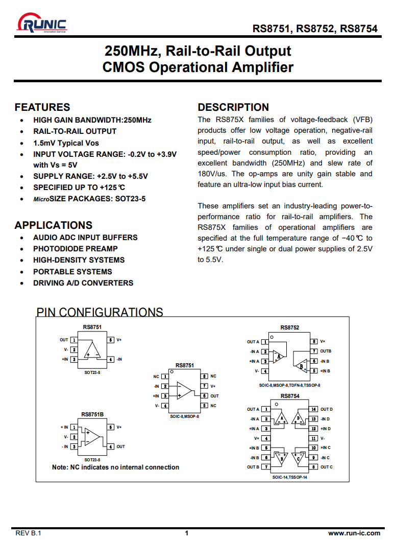 潤石 RS8751 單運放,用于信號處理。