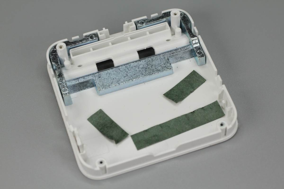 底座外殼上固定有鐵塊配置,此外貼有三條青稞絕緣紙。