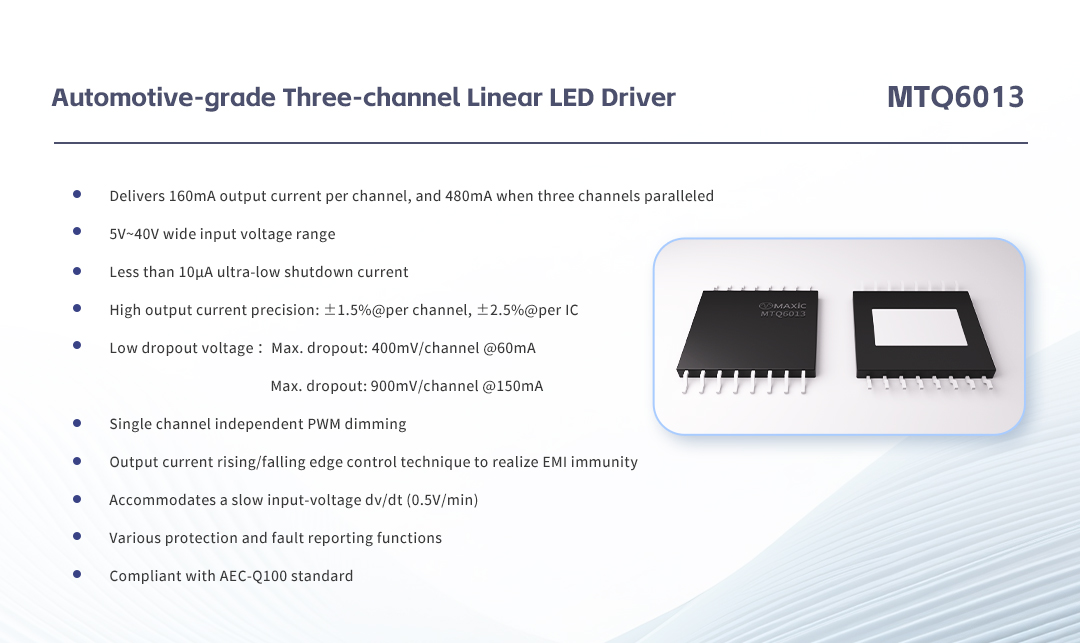 A number of automotive-grade chips of Maxic are included in the Catalogue, such as CAN SBC, in-vehicle wireless charging chips, LED drivers for car light, etc. This highlights industry recognition of Maxic Technology's automotive-grade products and its competitiveness in the automotive electronic field.
