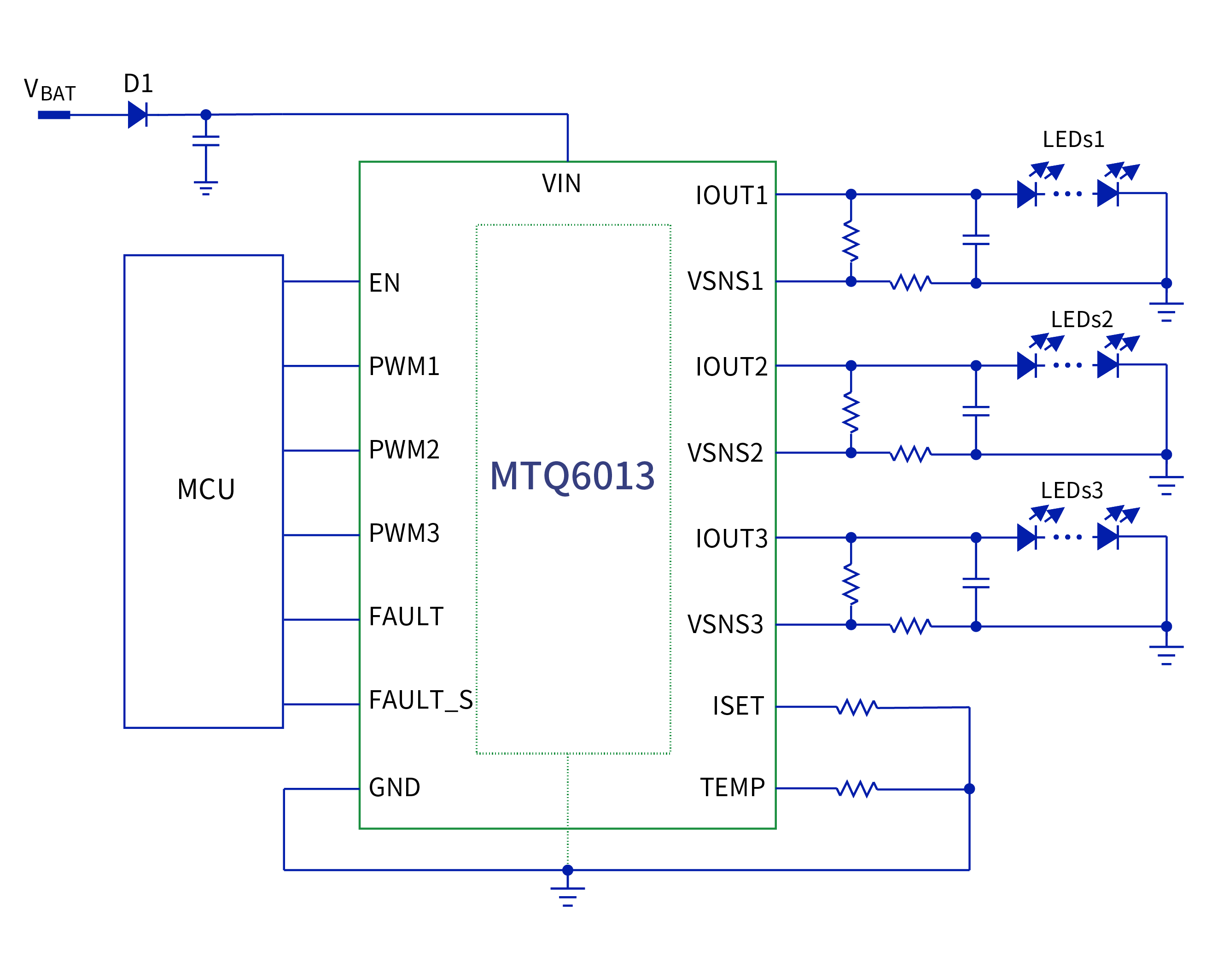 MTQ6013提供完整的診斷功能以滿足汽車級需求,擁有單顆LED短路故障報錯的FAULT_S引腳和用于報告開路、短路和熱關(guān)斷故障的FAULT引腳,雙故障引腳可滿足各種要求和應(yīng)用條件的故障診斷需求,確保系統(tǒng)可靠穩(wěn)定地工作。