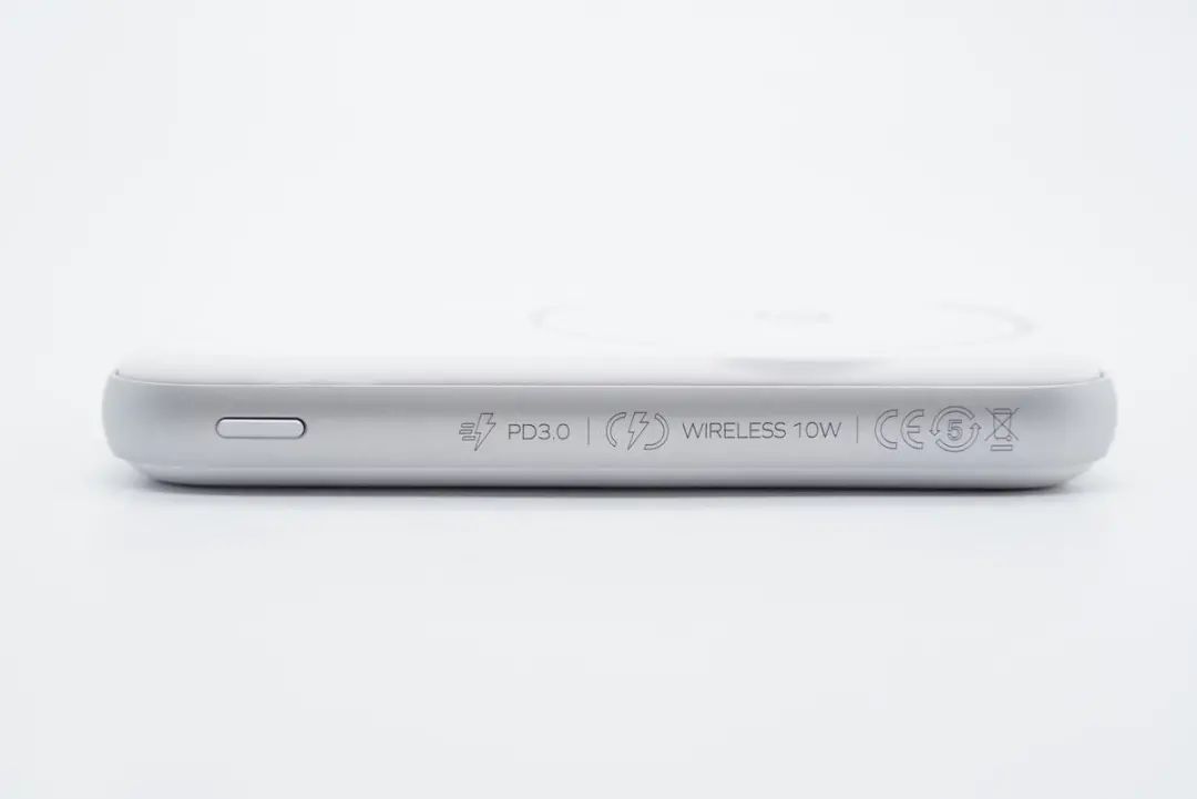 側(cè)面設(shè)有電源鍵,金屬殼上鐳雕PD3.0無線充標(biāo)識,充電寶通過了CE認(rèn)證。