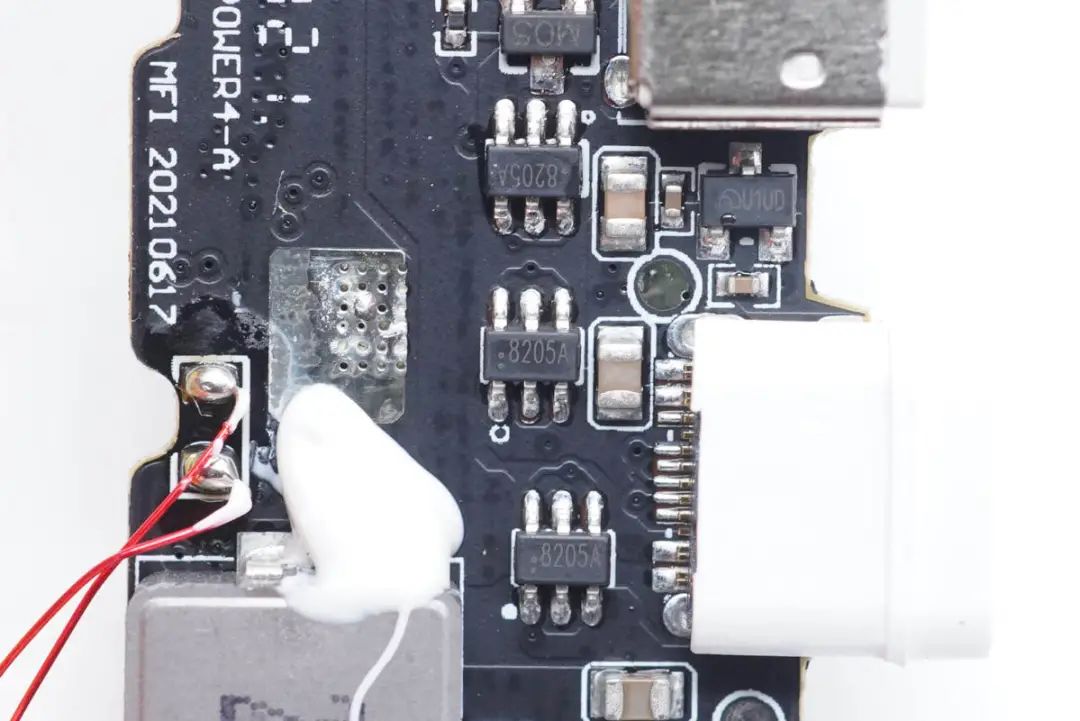 三顆絲印8205A的MOS管,用于接口保護(hù)。