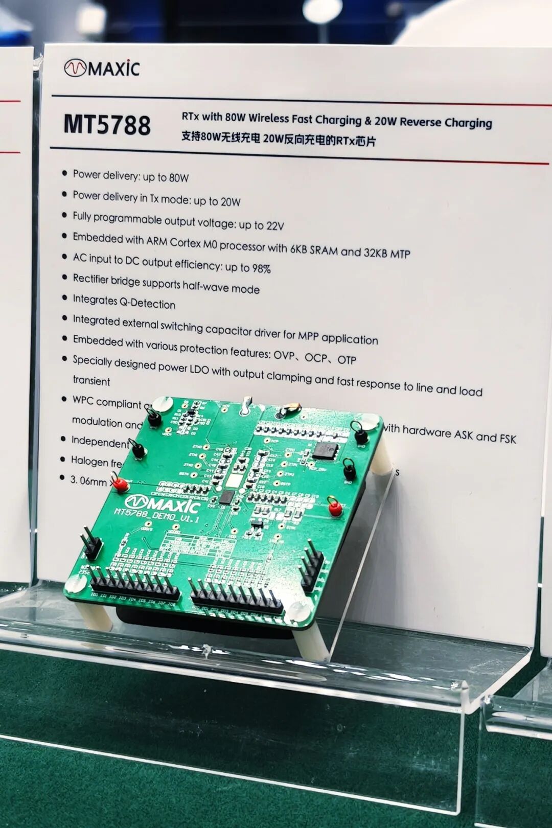 At the receiver side, Maxic showcased the MT5708, a 36W highly integrated, high-power-density wireless charging RTx, and the MT5788, a 100W high-efficiency RTx supporting BPP/EPP/MPP.