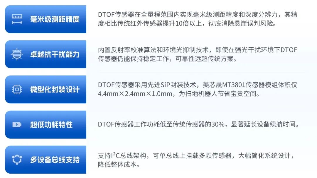 相較于傳統(tǒng)紅外和超聲波傳感器,DTOF(直接飛行時間)傳感器帶來了顯著的性能躍升,為掃地機器人提供了卓越的環(huán)境感知與避障能力,解決了長期困擾掃地機器人行業(yè)的痛點問題。